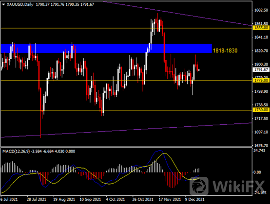 日线图显示金价震荡下跌,当前承压于1818至1830区间阻力。从MACD来看,快慢线向上运行,白色动能柱温和增量。金价走势和动能柱的变化呈分歧。