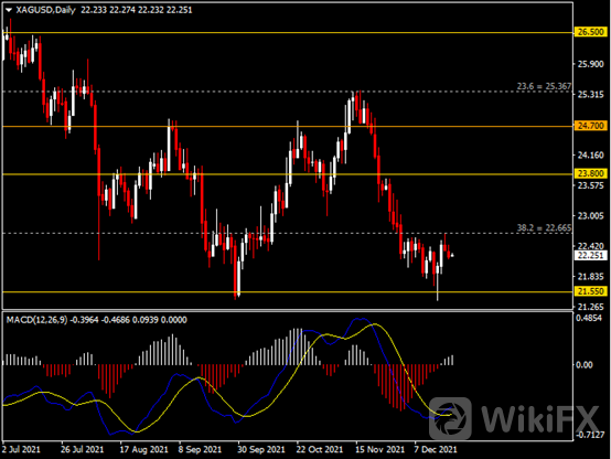 日线图显示银价回调下行,当前仍承压于22.65阻力。从MACD来看,快慢线金叉依旧,白色动能柱温和增量。银价走势和动能柱的变化呈分歧。