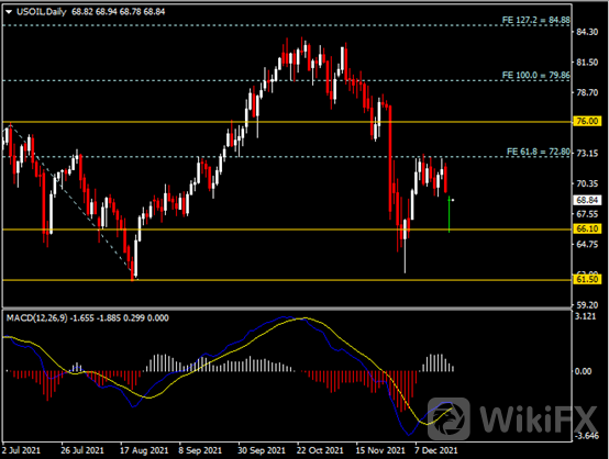 日线图显示油价先跌后涨,当前持稳于66.10支撑。从MACD来看,快慢线略呈收窄,白色动能柱逐渐收缩。油价走势和动能柱的变化呈分歧。