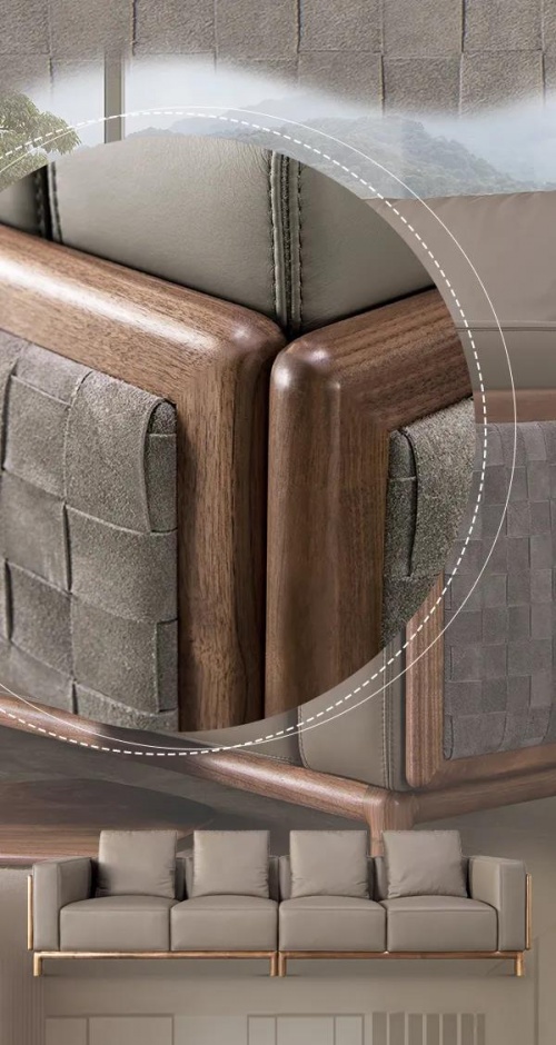 传承“席居文化”内涵的FS11580沙发,以中国传统席文化的方格编织元素为主,借鉴西方的时尚手法,打造摩登时尚的客厅艺术装饰,当阳光穿插在皮与皮之间的缝隙时,三面反向编织皮带的工艺,捎来明暗交织的色彩,这是岁月流淌的诗篇,三维立体的螺旋靠枕,能最大程度瓦解腰部曲线的疲乏,将东方哲学精粹与国际人文艺术相结合,缔造出优雅、惬意的当代生活方式。