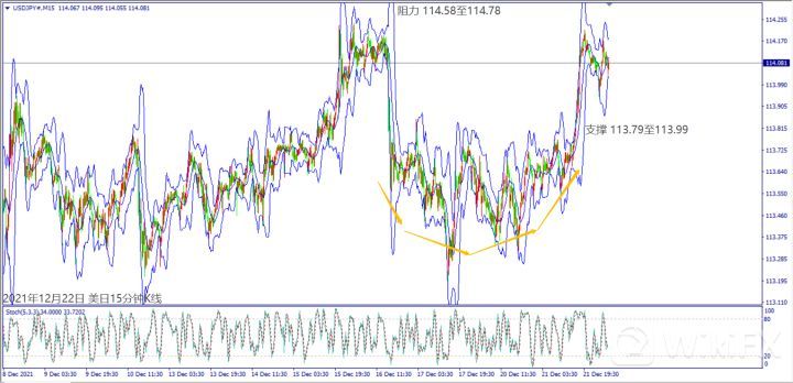 日级别线图,长阳烛创12月收盘新高,守住30日均线,有望延续涨势;15分钟K线,出现圆形底反转,守稳114.00关口,大有可能挑战上方阻力。
