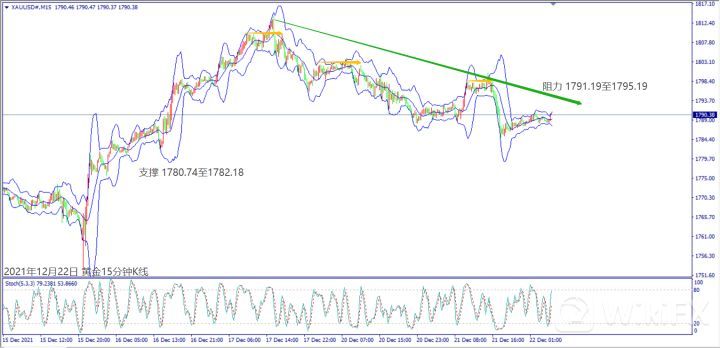 日级别线图,连续下跌掼破60日均线,冲不过该均线,可能回测1780关口;15分钟K线,短线形成盘跌,下降趋势线反压,大有可能下探支撑。