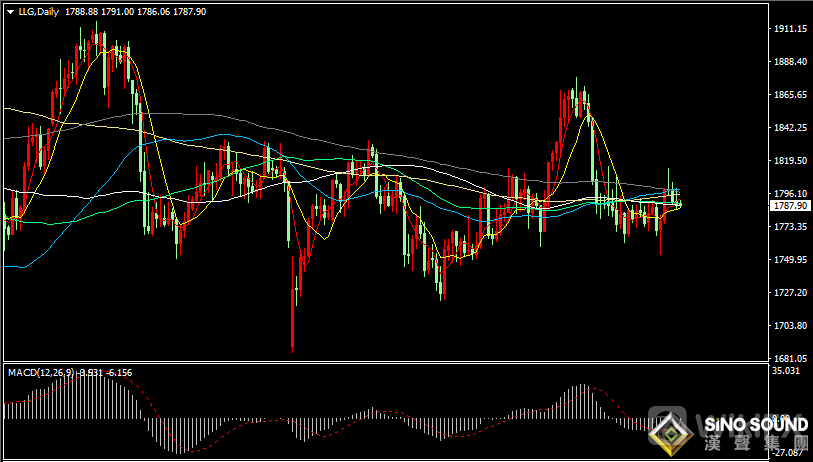 现货黄金走势看,日内金价在5日与10日均线之间振荡运行,从近期走势看,金价录得四条长上影线阴线下跌。同时显示,中长期均线对金价存在一定压制,使得近期金价多次冲高回落,目前金价持续在1785-1790区盘整。日线指标看,MACD指标负动能柱持续,RSI指标有所朝下至47位置附近。