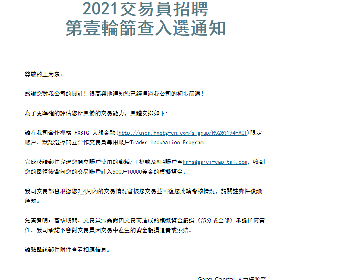 对FXBTG招聘交易员活动的投诉,投诉者指出:无论在模拟交易期间参与者的交易盈利是超过5%还是达到30%,最终都不会入选成为FXBTG的交易员。