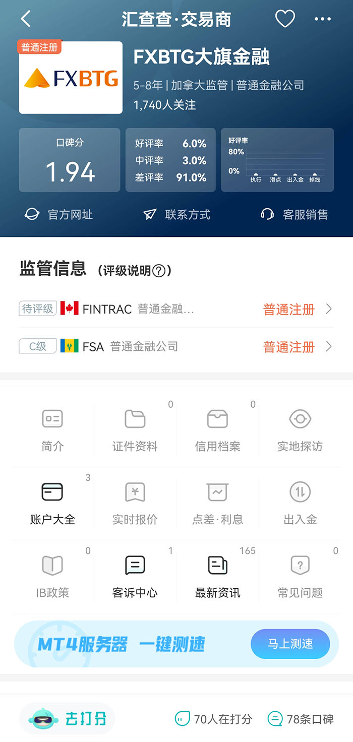 经查询,发现FXBTG大旗金融在加拿大FINTRAC和圣文森特和格林纳丁斯FSA两个机构都有注册,但仅仅“普通注册”,没有金融牌照,也就没有获得任何监管,投资者资金安全难以保障。