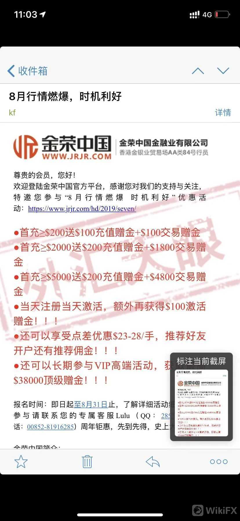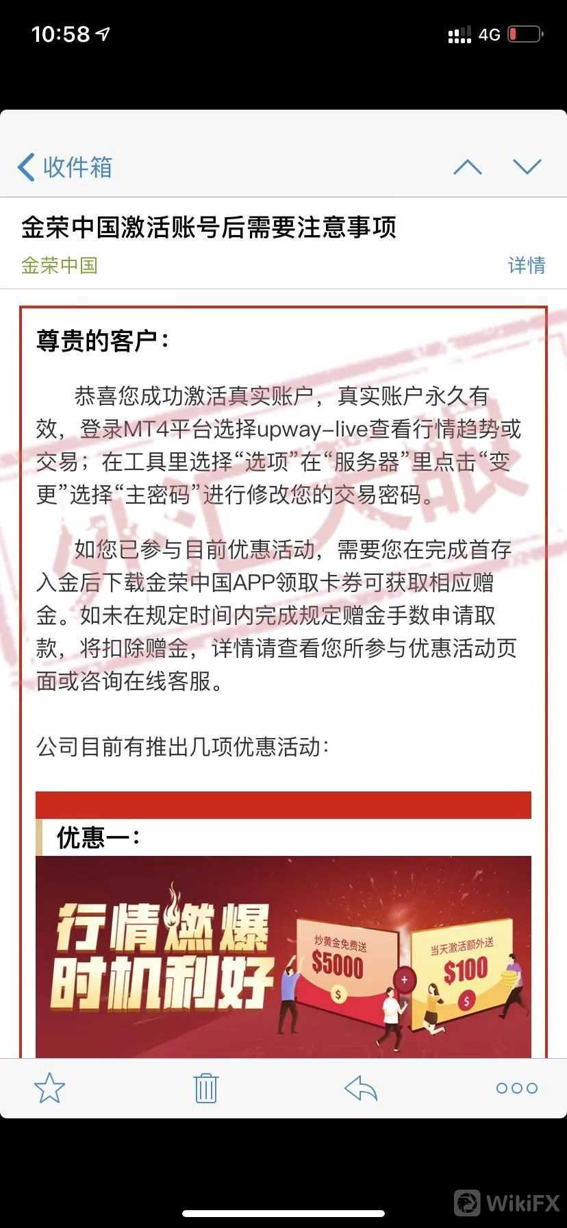 同时金荣中国还发送了宣传的资料到朱先生邮箱中,这样的情况下朱先生对于平台的资质深信不疑。特别是朱先生之前没有接触过外汇,平台的客服介绍称外汇可以以小博大,比股票的利润高,自然就心动了。