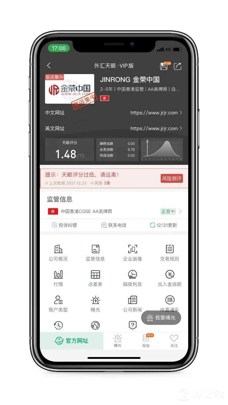 在外汇天眼上查询可知,JINRONG金荣中国天眼评分1.48分,虽然持有的中国香港CGSE的AA类牌照仍然在监管中,但是曝光台中出现了多达30条以上的客诉,存在巨大风险,建议投资者远离。