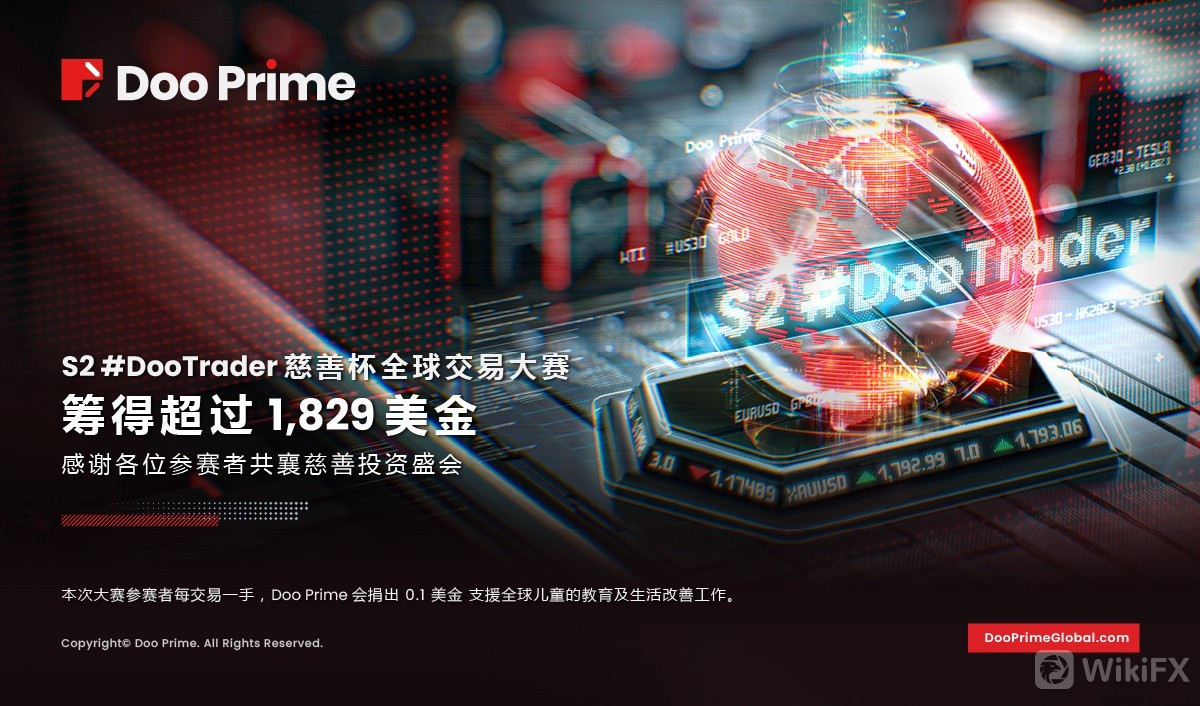 本次大赛中每 1 手的交易,Doo Prime 将会捐出 0.1 美金善款,本次大赛共筹得 1,829 美金。该笔善款将全数捐出,用于支持全球贫困儿童的教育工作。再次感谢全球参赛者的参与,与 Doo Prime 一起以交易之名,启动全球慈善行动。