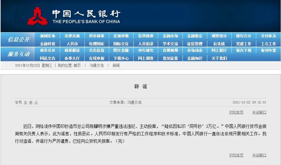 12月22日早间,央行辟谣。“此为谣言,性质恶劣。”央行货币金银局有关负责人表示。人民币印制发行有严格的工作程序和技术标准,中国人民银行一直依法依规开展相关工作。对造谣、传谣行为严厉谴责,已经向公安机关报案。