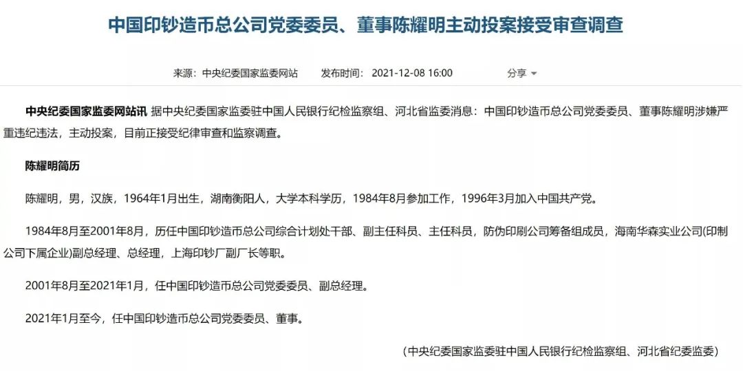 于12月8日就已公开的“中国印钞造币总公司陈耀明涉嫌严重违法违纪、主动投案”报道,12月21日晚间冲上微博热搜榜首,原因是网络流传一版陈耀明投案的所谓“细节”——疑似因私印“同号钞”2万亿元。