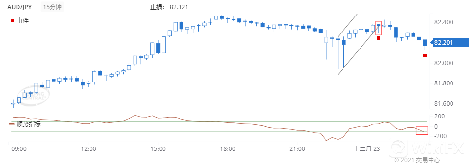 通过,于2021年 12月 23日(GMT时间02:30)CCI向下穿越-100%水平线,进而触发了利空信号。