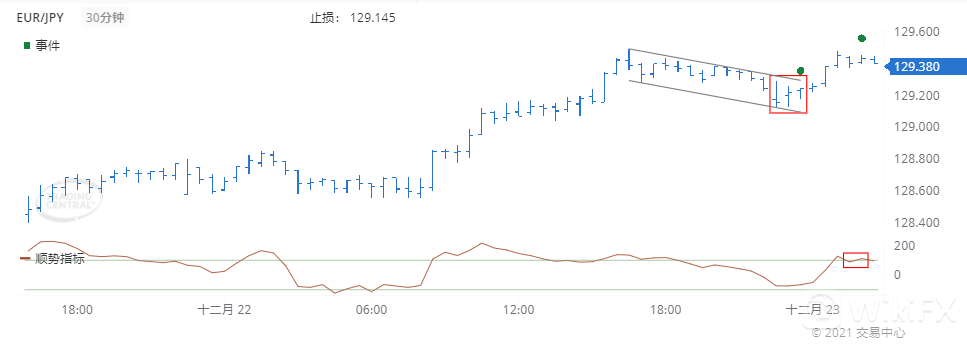 2021年 12月 23日(GMT时间02:00)CCI向上穿越+100%水平线,从而触发了利好信号。