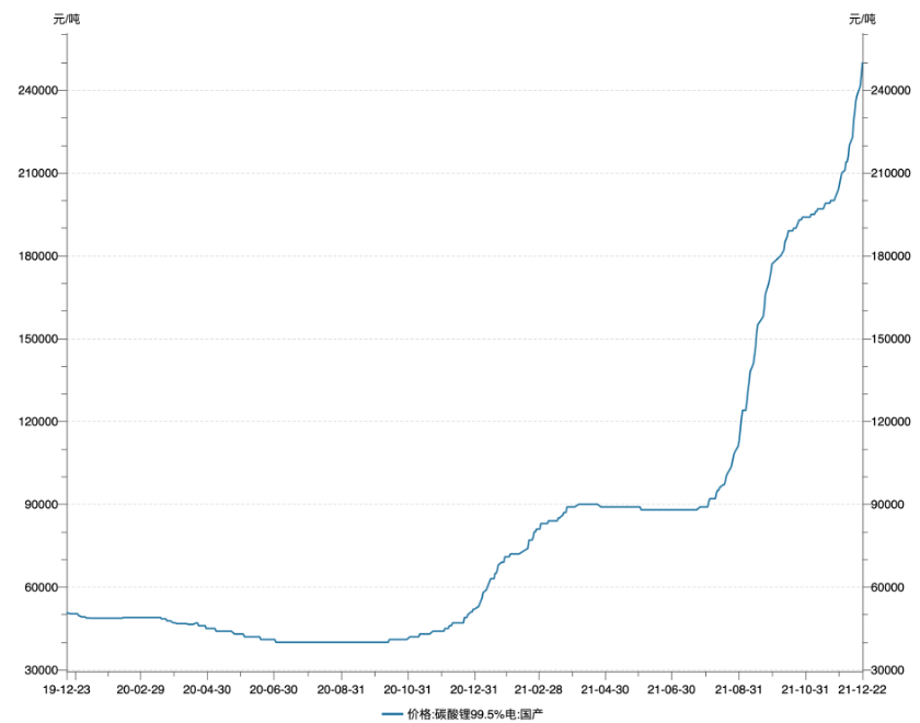 Wind数据显示,电池级碳酸锂的价格年内翻了4倍不止,至今不见回调。