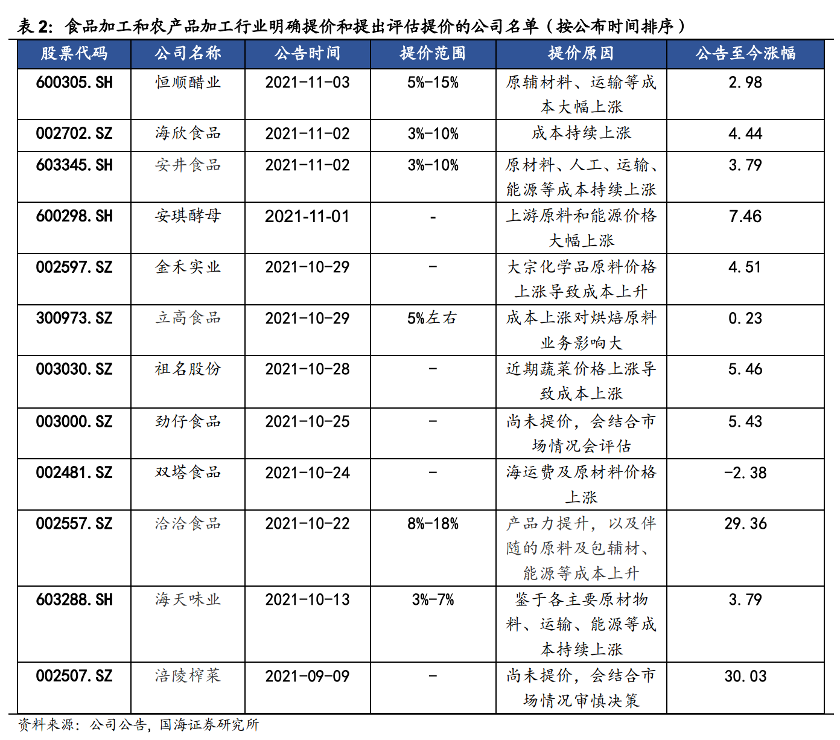 国海证券的分析师就发现,所有提价的公司都将原因归咎于原材料价格上涨,其中包括大宗化学品及蔬菜等原辅材料,还有36.4%的公司提到了人工和运输成本的上涨。