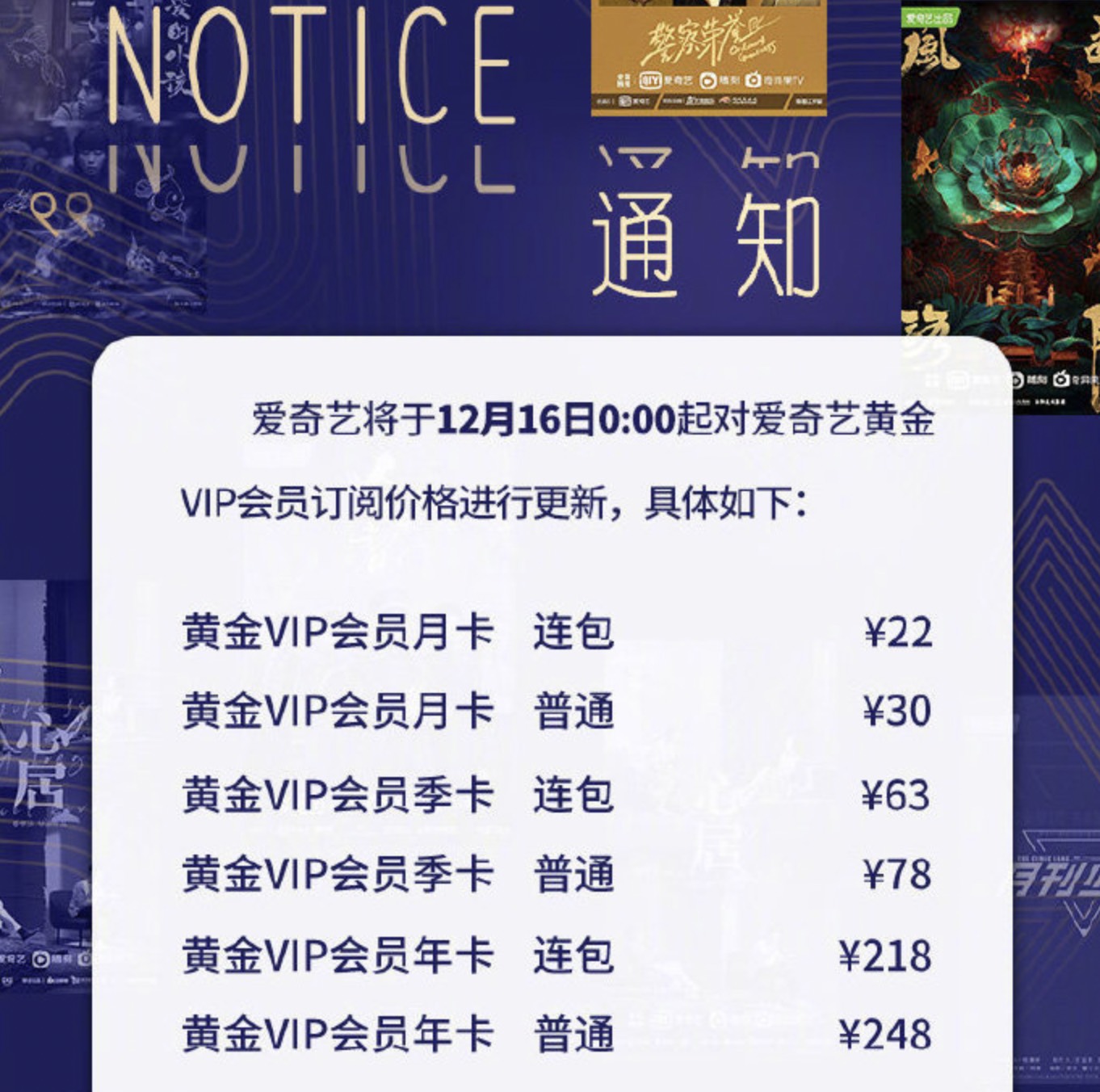 12月15日,爱奇艺(IQ.NASDAQ)率先涨价,包月费用从25元涨至30元,连续包月价格从19元涨至22元,季卡价格从68元涨至78元,普通年卡价格暂时不变。