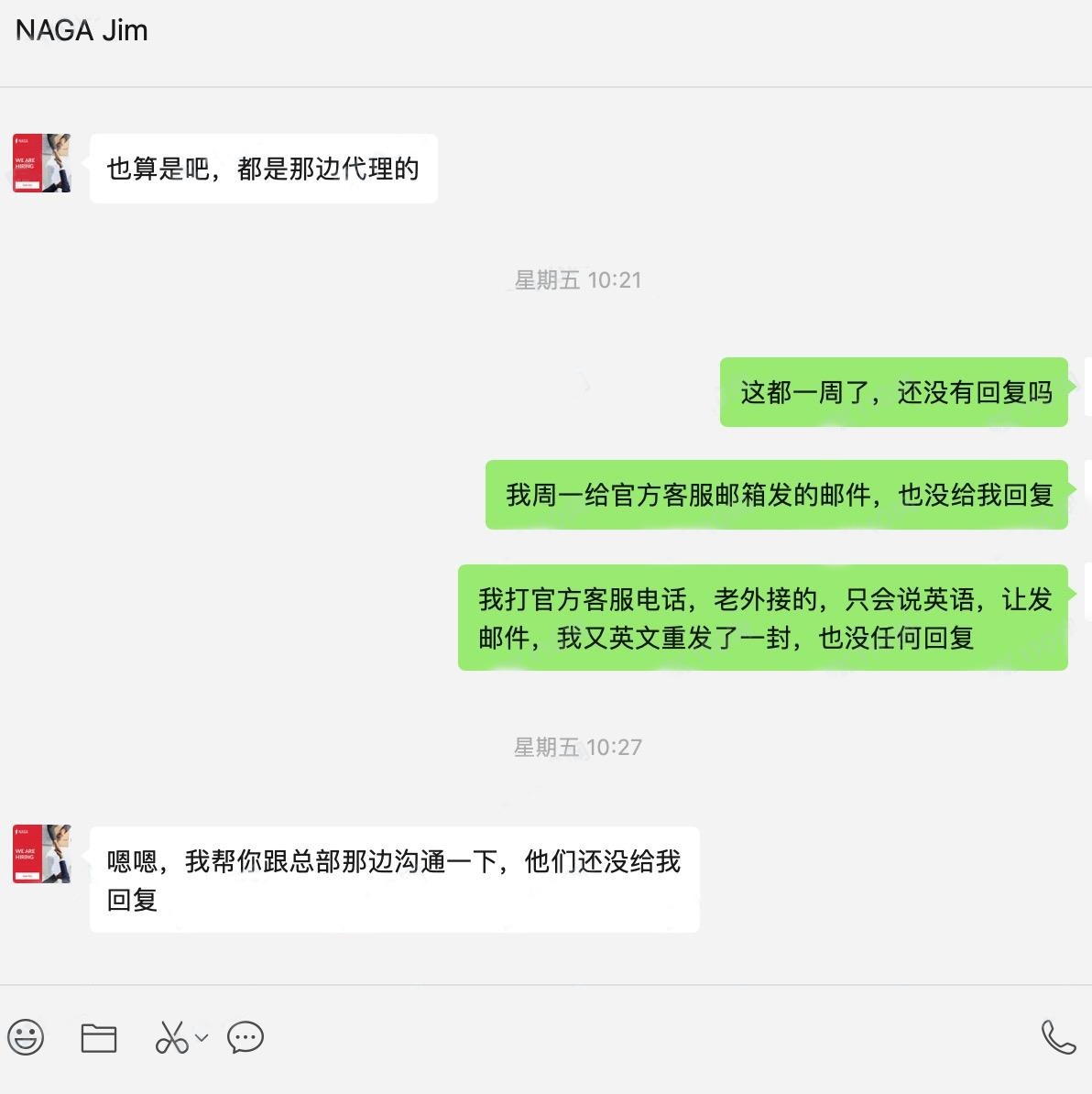 万般无奈,11月30日该代理商只好往合作邮箱发送了一封反馈邮件,质问代理账号被锁定的原因。等了一个多星期,邮件如石沉大海,没有任何回复。所有渠道尝试联系NAGA都无果,他只好咨询客户经理,客户经理回复称:“帮你和总部沟通了一下,他们还没给我回复”。