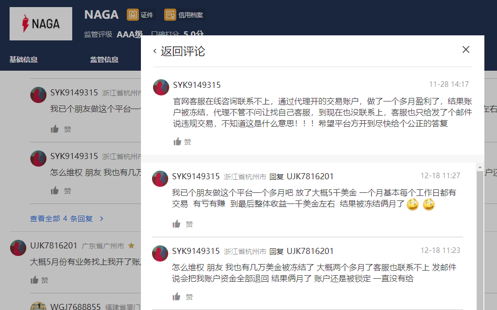 从交易商口碑评论可以看出,10月底还有用户反馈其遇到出金问题,但客户经理解决了问题。而口碑出现滑铁卢也就在11月底到现在,有天网查用户及其身边的朋友都遇到了盈利无法出金账户被冻结的情况。