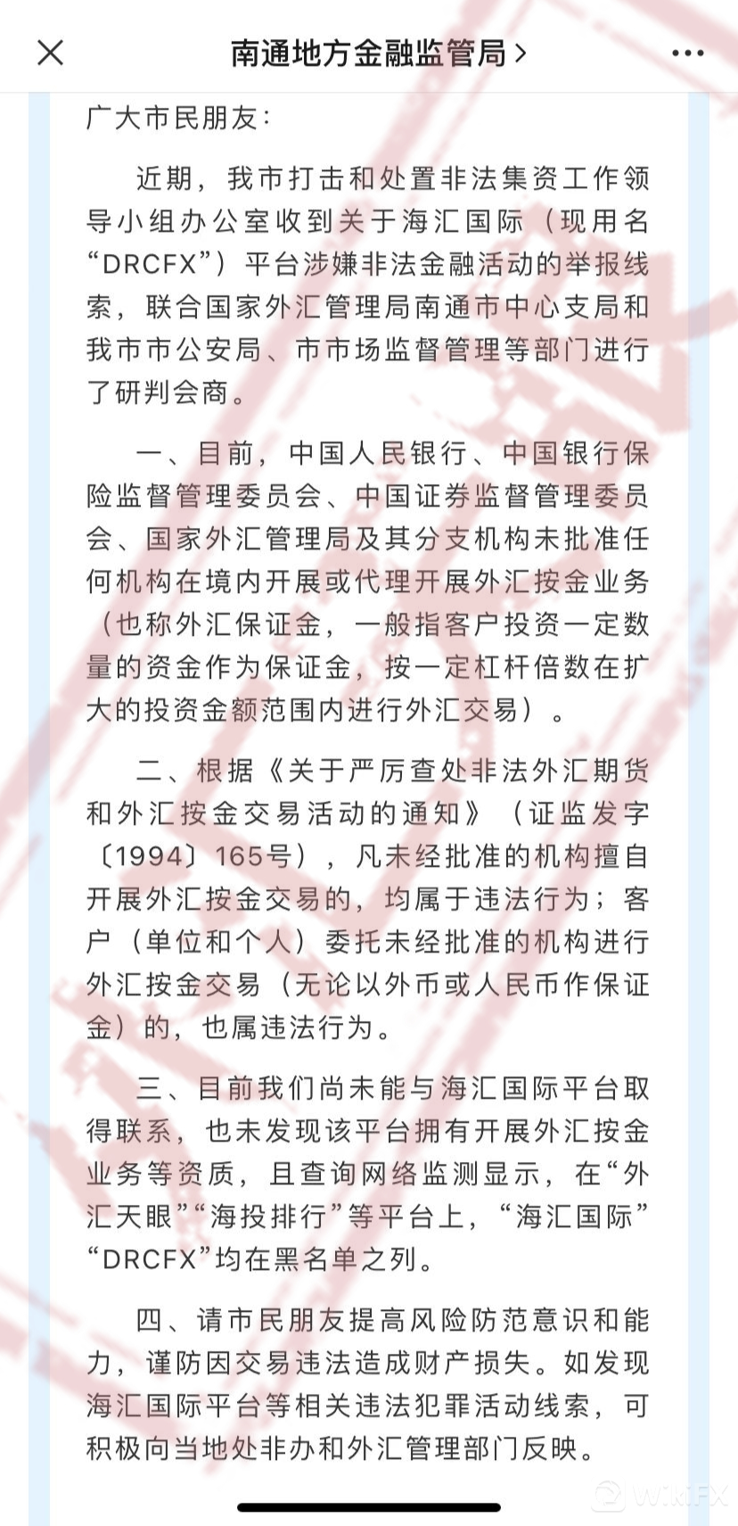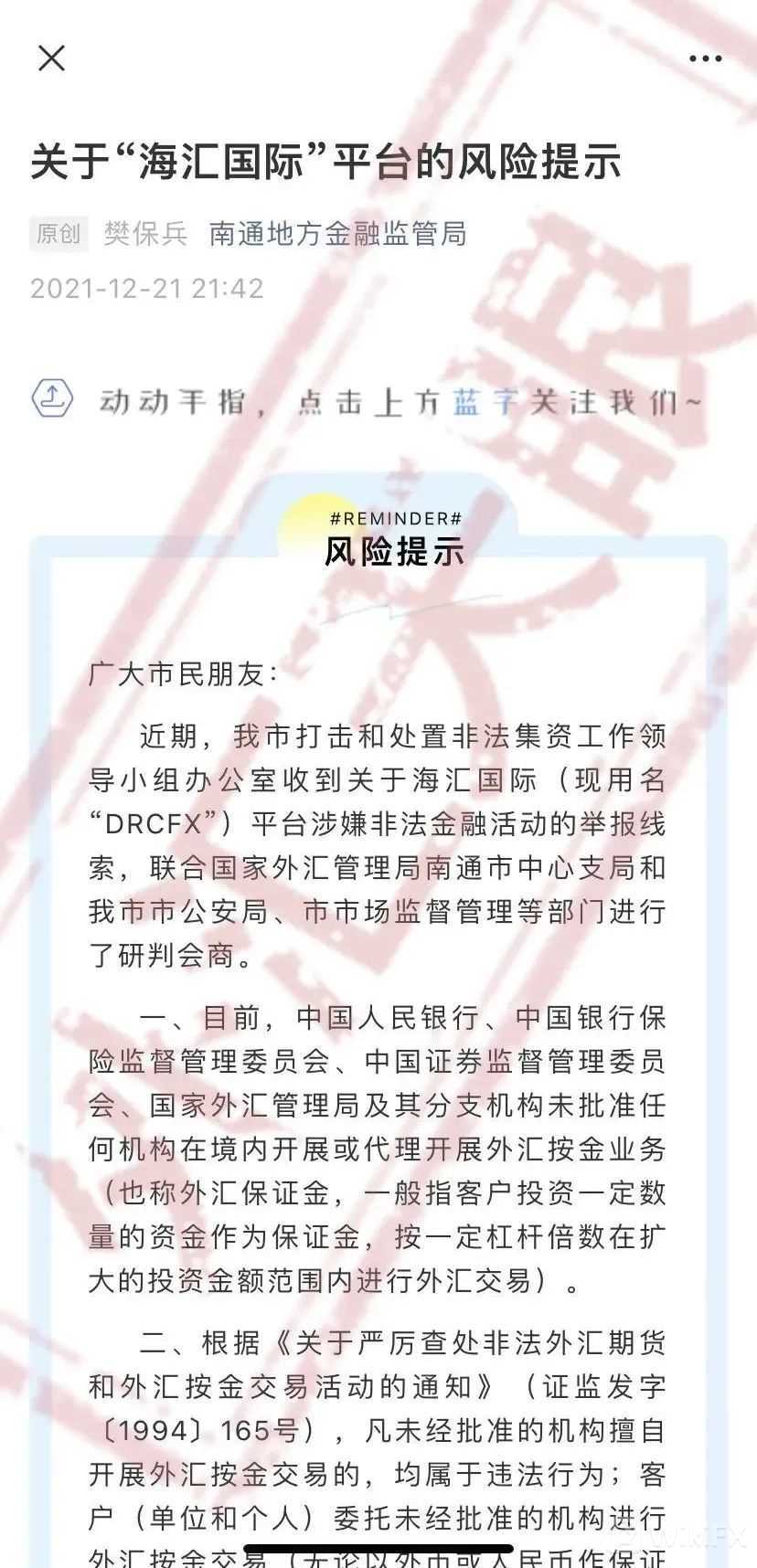就在近日,南通地方金融监管局发布了一则《关于“海汇国际”平台的风险提示》,表示打击和处置非法集资工作领导小组办公室收到了关于海汇国际(现用名“DRCFX”)平台涉嫌非法金融活动的举报线索,通过与外汇管理局、公安、市场监督管理等多部门的研判会商后,发现海汇国际存在风险,请市民朋友提高风险防范意识和能力,发现海汇国际的相关违法犯罪活动线索,积极向当地政府和外汇管理部门反映。
