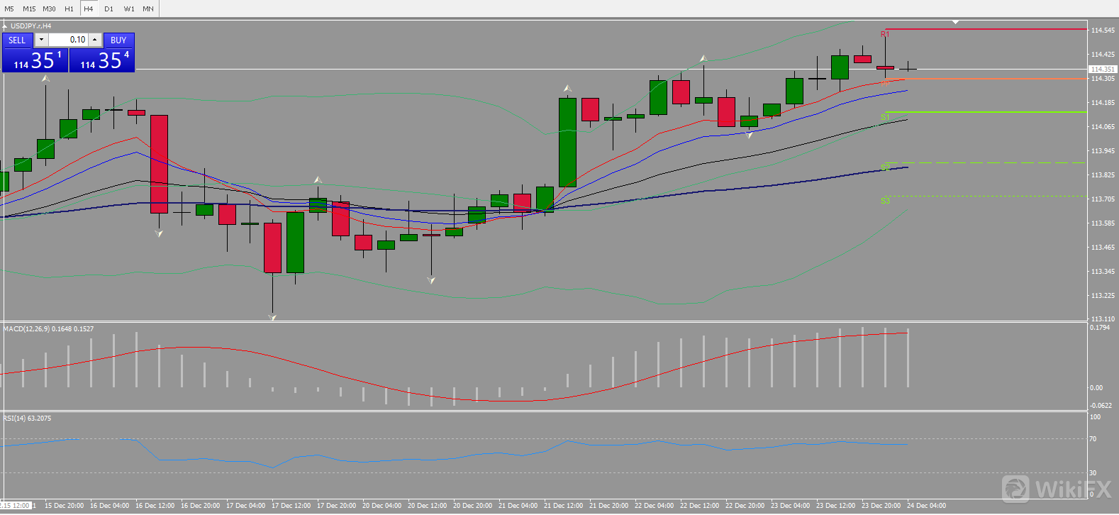 美日价格小幅上涨114.35附近,主要风险情绪的上升以及低流动性促使日元也遭到了抛售,鉴于风险情况下在新年前不会改变,短期有进一步上升的趋势,但在目前的情况下,即使低流动性会持续,短期美日仍缺乏进一步的上升空间的理由,总体保持高位震荡观点;