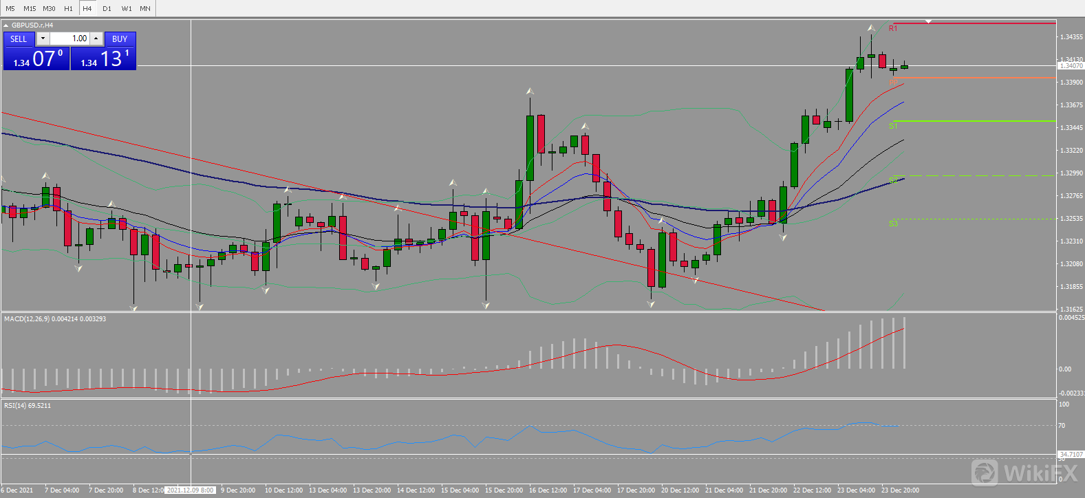 日线图在11月19日开始的高点形成下跌趋势线以上,RSI 53,完成突破。预计价格将进一步上涨,较大可能在1.34484附近受阻。