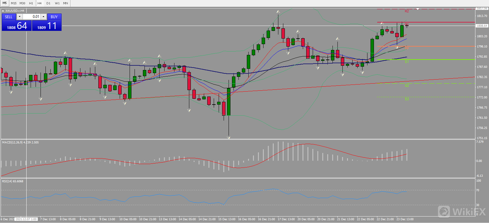 日线图RSI 57,保持见顶1821附近的看法,布林带平行打开,价格触及布林带上轨,目前无明显回调迹象,支撑位1791.46,阻力位1810.52,预计保持窄幅波动。