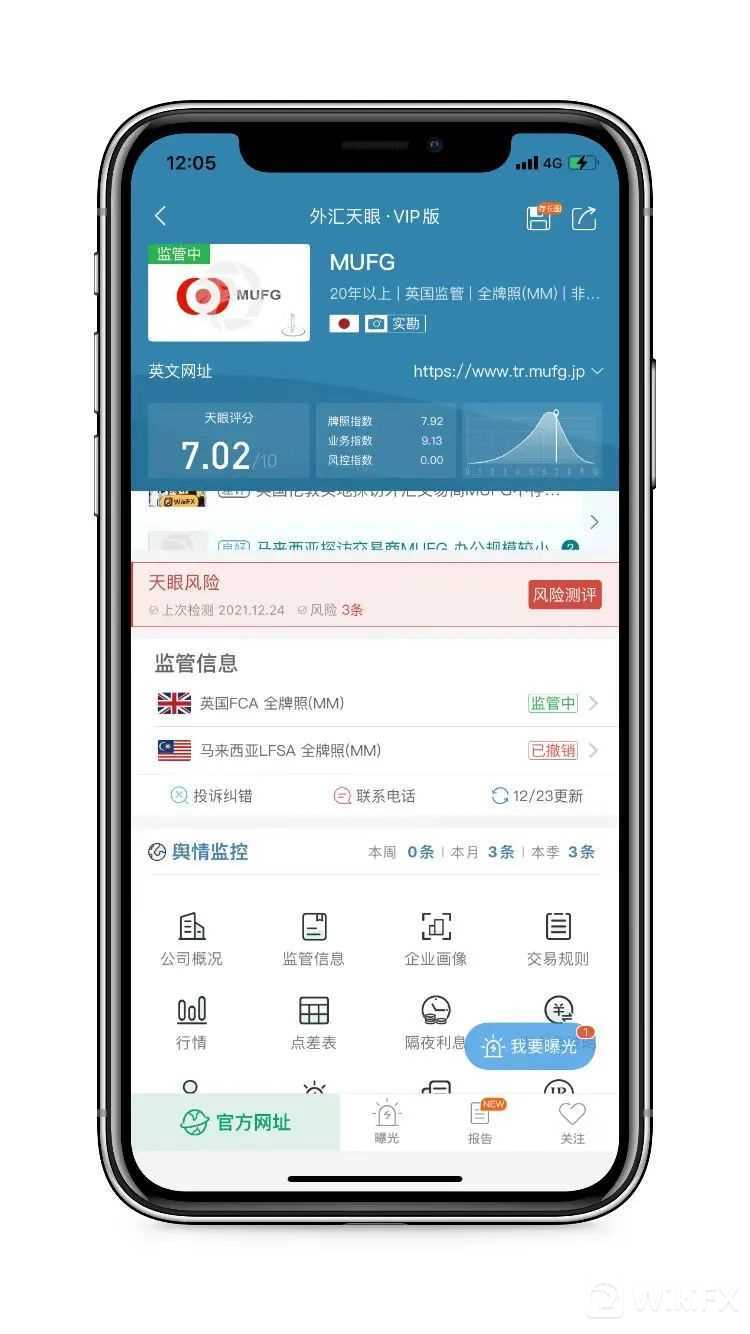 MUFG,天眼评分7.02分,其宣称持有的牌照被撤销后,尚有英国FCA授权的全牌照正在监管中,曝光台中出现了一则客诉,建议投资者们注意甄别!