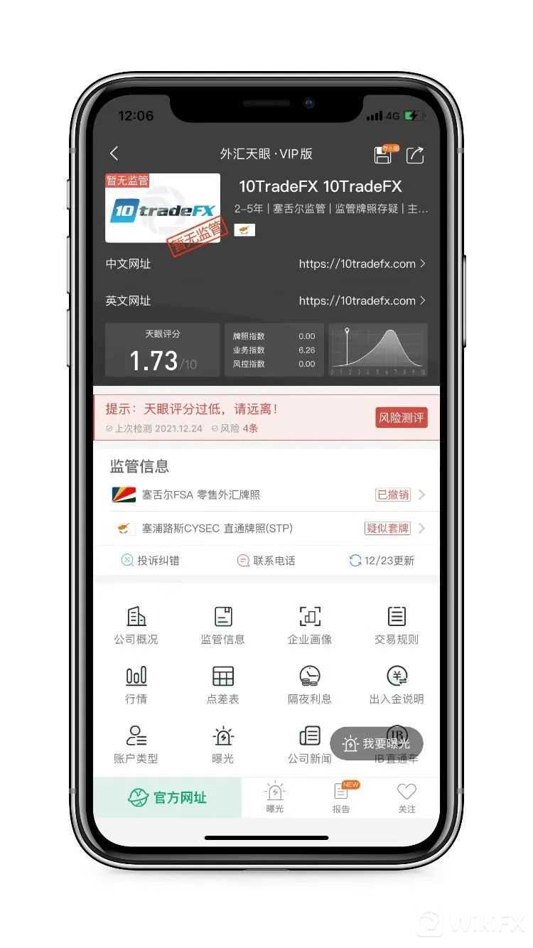 10TradeFX,天眼评分1.73分,其宣称持有的牌照被撤销后,另一个塞浦路斯授权的直通牌照疑似套牌,当前暂无任何实际有效的监管牌照,存在巨大风险,建议投资者们远离。