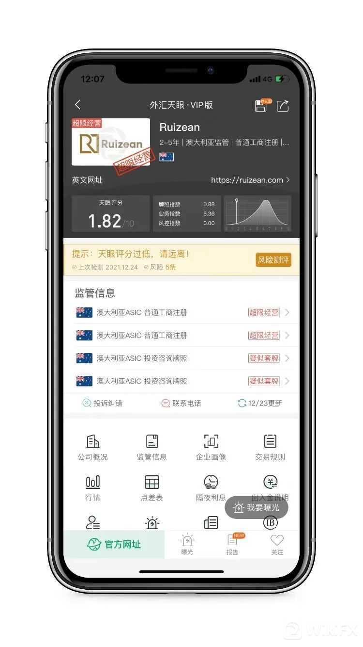 Ruizean,天眼评分1.82分,其宣称持有的牌照均被撤销后,当前暂无任何实际有效的监管牌照,存在巨大风险,建议投资者们远离。