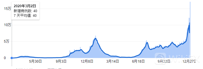 英国在圣诞节期间未公布确诊人数,27日更新数字后,居然出现31.86万人的单日新增,创出历史最高值。很显然,圣诞节的人口流动加速了新冠病毒的传播。