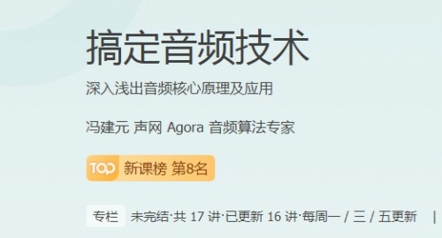 从当前来看,音视频开发是一片蓝海,其现状是技术人才少、待遇较高,而且未来这类人才会更加吃香。极客时间推出音频类课程,可以带领大家更好地提升专业能力。以《搞定音频技术》为例,其作者是声网Agora音频算法专家冯建元,课程分为音频基础知识、音频降噪、回声消除等模块,还整理了大量的相关文献链接和课后思考题,帮助学员们充分理解里面的知识点。