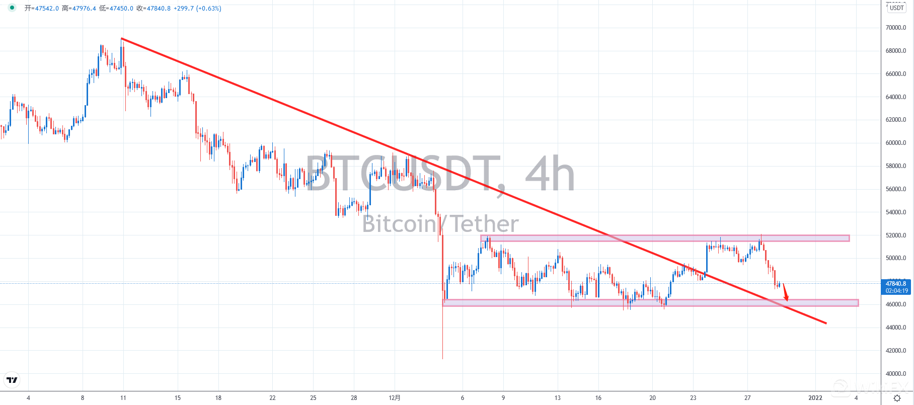 【技术点评】:H4周期,比特币阻力位空头发力,日内大概率测试46000水平支撑位。