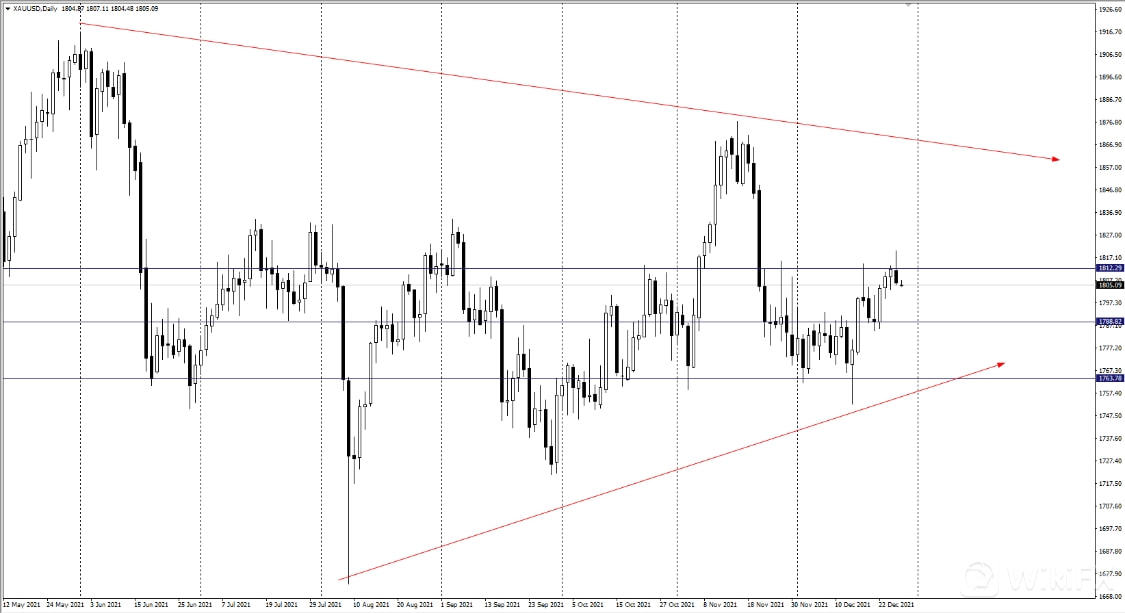 11月以来黄金一直维持在相对狭小的空间进行震荡,因为对于疫情以及通胀不确定打击了市场的积极性。在这种情况下大多数人选择购买债券,短暂的抛弃了无息的黄金。
