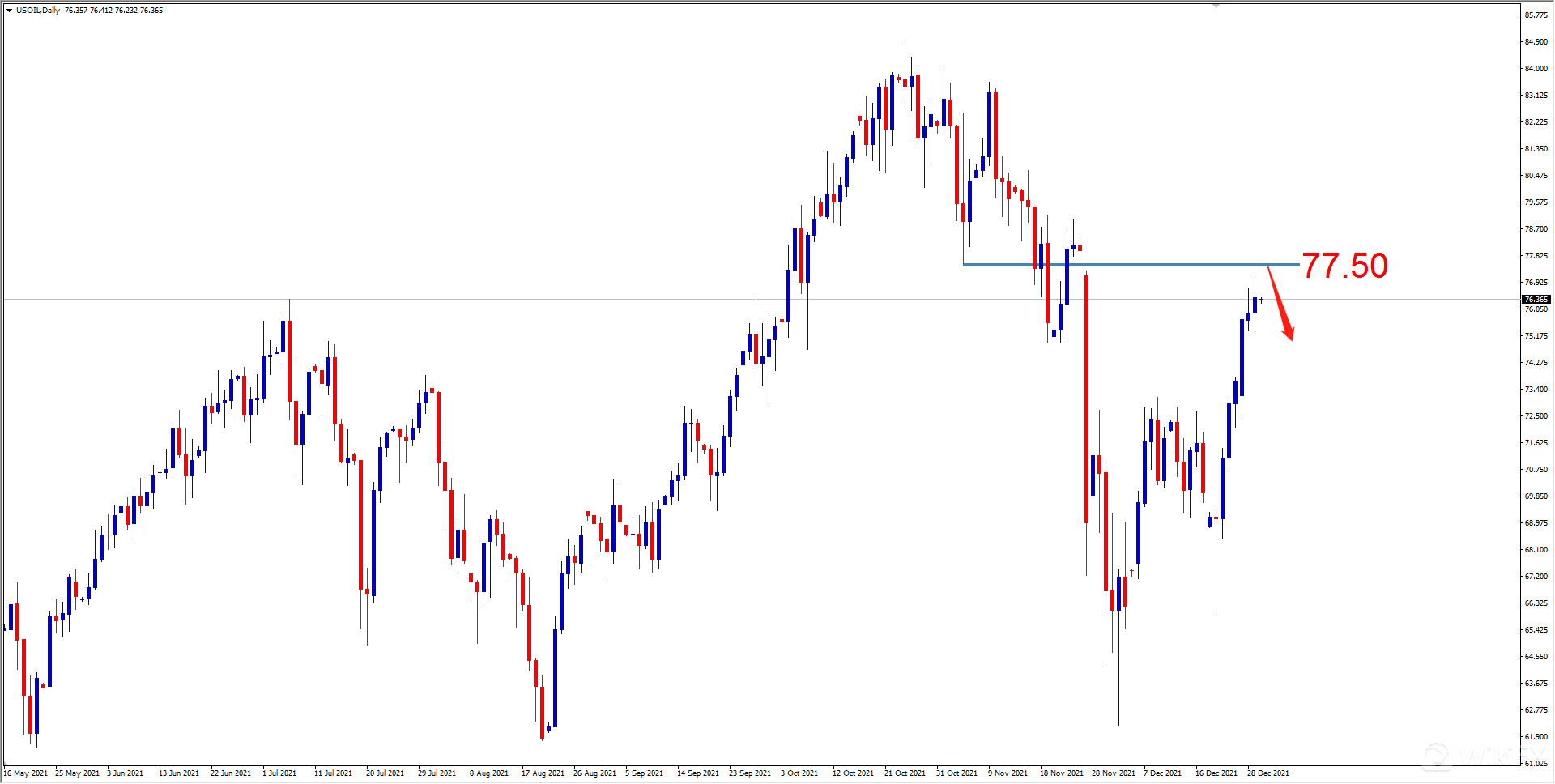 【交易策略】:目前市场或重回空头流向,建议投资者可考虑关注77.50附近做空,止损78.60左右,止盈75.00左右。