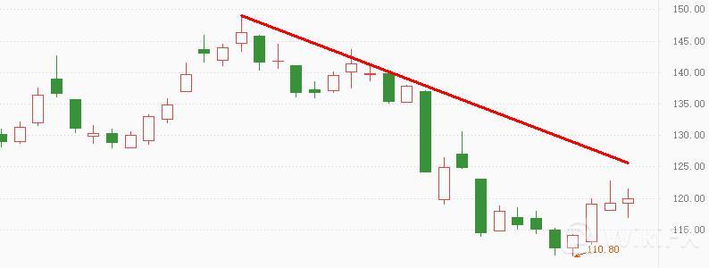 虽然本周累计涨幅超过7%,但中短期趋势依旧为空头。在红色下降趋势线没有被有效涨破之前,不宜参与药明康德多头操作。周线级别存在两个支撑位,121已经被跌破,100整数关口支撑仍有效。由于周线级别已经形成显著“头肩顶”结构,且121即为颈线位,所以后市保持回调状态的概率较高。