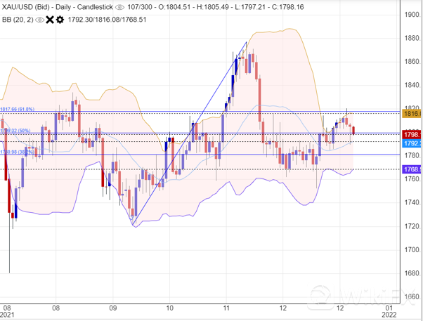 周三(12月29日),美國長期國債收益率在周三上升,美國財政部標售560億美元的七年期公債,市場反應一般,此次標售的得標利率是1.48%,較標售前的二級市場高2個基點。加上市場對新變種病毒株的憂慮持續降溫,美股道指連升數天反映市場的風險情緒强勁,金價受打壓,最低一度見1789美元,但其後收復失地,收盤站在1800以上報1804美元。