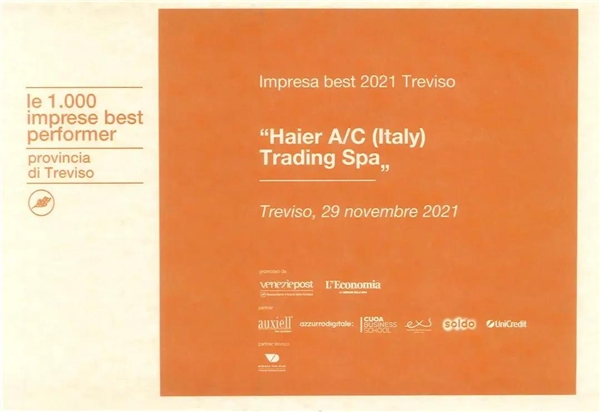 海尔智家自主创牌成效显著,在海外各区域市场不断取得新成果。当地时间11月30日,意大利研究中心对Treviso(特雷维索)地区的公司进行调查,评选在当地发展势头强劲的公司,并为他们进行了颁奖。海尔智家意大利空调荣获Treviso最佳表现奖。