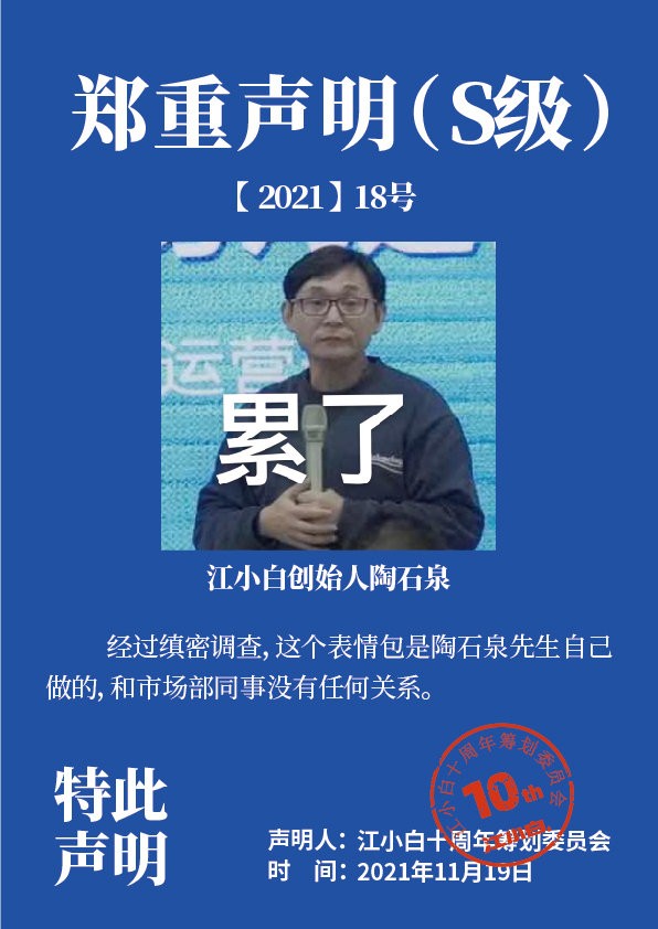 这份在网络上引发广泛关注的“声明”,其内容大多和江小白创始人陶石泉有关,比如“老板@陶石泉觉得全公司的人都没有他会做直播”、“这个表情包是陶石泉先生自己做的,和市场部同事没有任何关系”……诙谐的语气和市面上那些严肃的白酒品牌的格调形成了鲜明对比,站在十周年时间节点上的江小白给人的感觉是朝气蓬勃。
