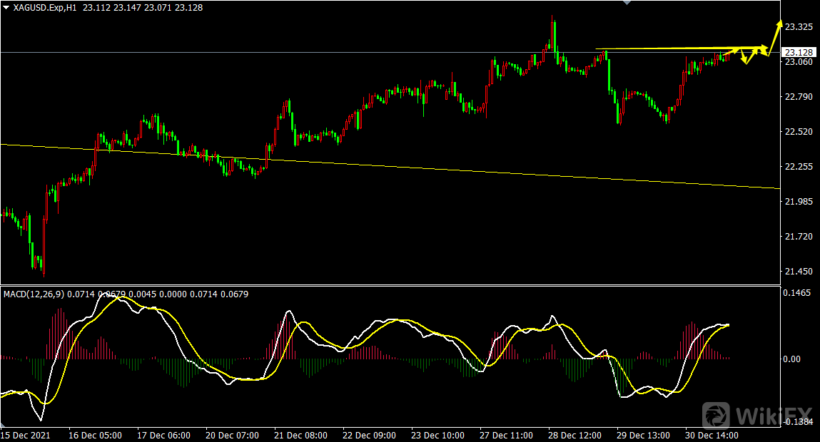 从国际白银1小时图来看,白银接下来大概率也会随之上破,暂时可以小仓位埋伏进场,等待出现明显的阳线拉升可以加仓,后市极可能会开始趋势行情,做多可以考虑长持。