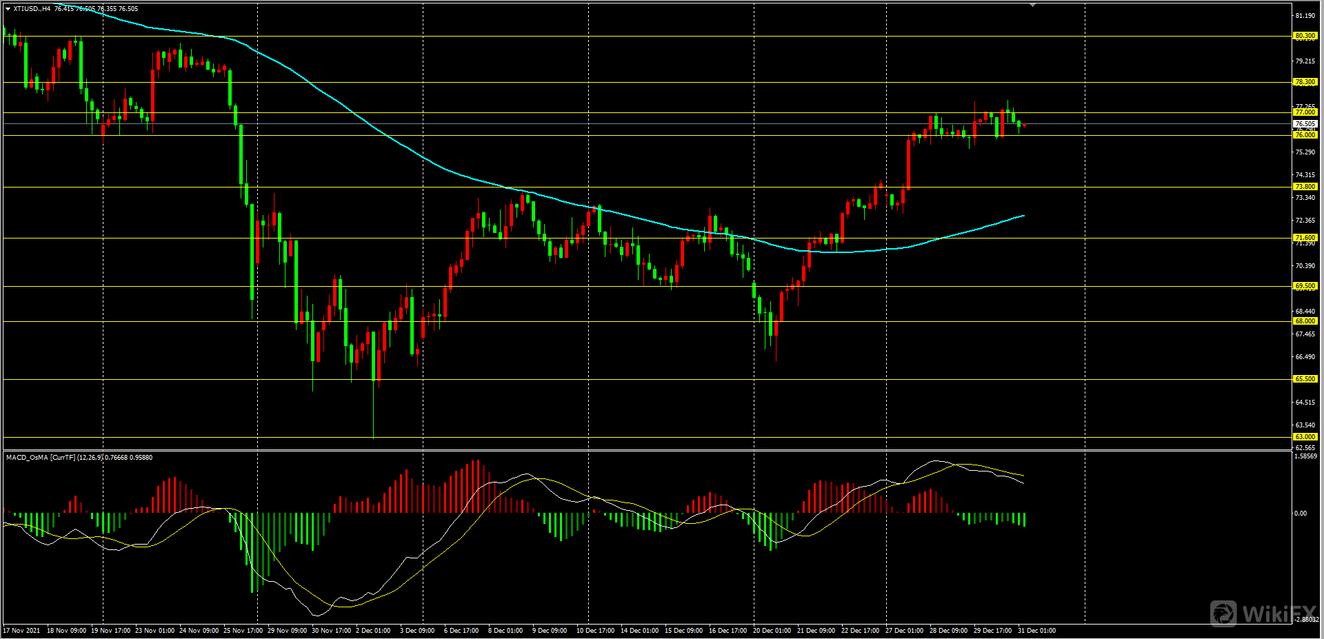 XTIUSD昨日开盘76.685,最高77.515,最低75.855,收盘76.595,日线收十字星,窄幅震荡。