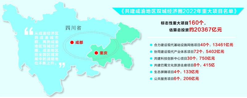 2022年,这是成渝地区双城经济圈建设从夯基垒台迈向整体成势的关键一年,2月9日,推动成渝地区双城经济圈建设联合办公室(以下简称双城办)正式印发的《共建成渝地区双城经济圈2022年重大项目名单》,160个标志性重大项目被纳入名单,总投资超2万亿元,当年度计划投资1835亿元。