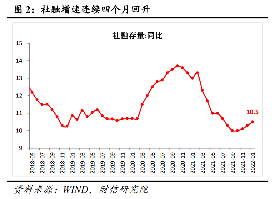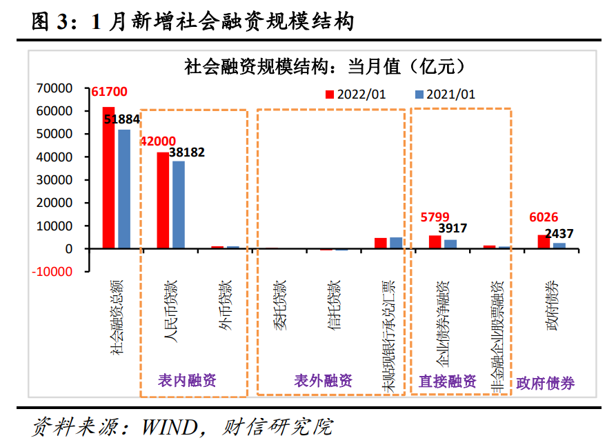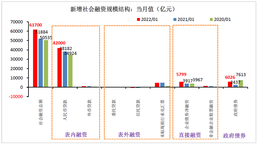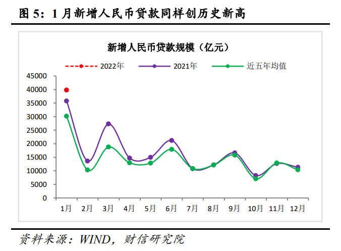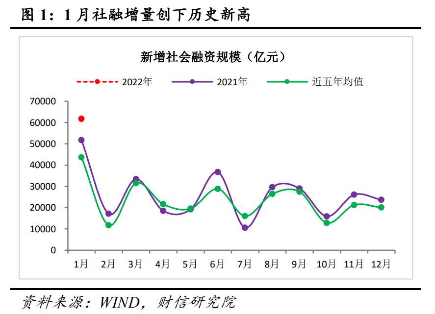 事件:2022年1月份社融增量为6.17万亿元,创下历史新高,比上年同期多增9842亿元;新增人民币贷款3.98万亿元,同为单月统计高点,比上年同期多增3944亿元;货币供应量M1、M2分别同比下降1.9%、增长9.8%