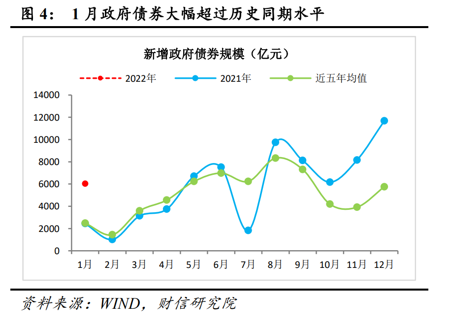 (一)人民币贷款、政府债券和企业债是助力社融开门红的主因。一是受国内货币政策加大宽松力度且注重靠前发力,引导金融机构有力扩大信贷投放影响,1月新增人民币贷款(社融口径)同比多增逾3800亿元,是本月社融的最大支撑因素。二是受益于财政加快发力下专项债发行前置,政府债券同比多增3589亿元(见图4),也对社融形成重要助力。三是受国内利率回落较多和基建等配套融资需求回暖影响,企业债券发行市场继续改善,本月企业债净融资额亦同比多增1882亿元。