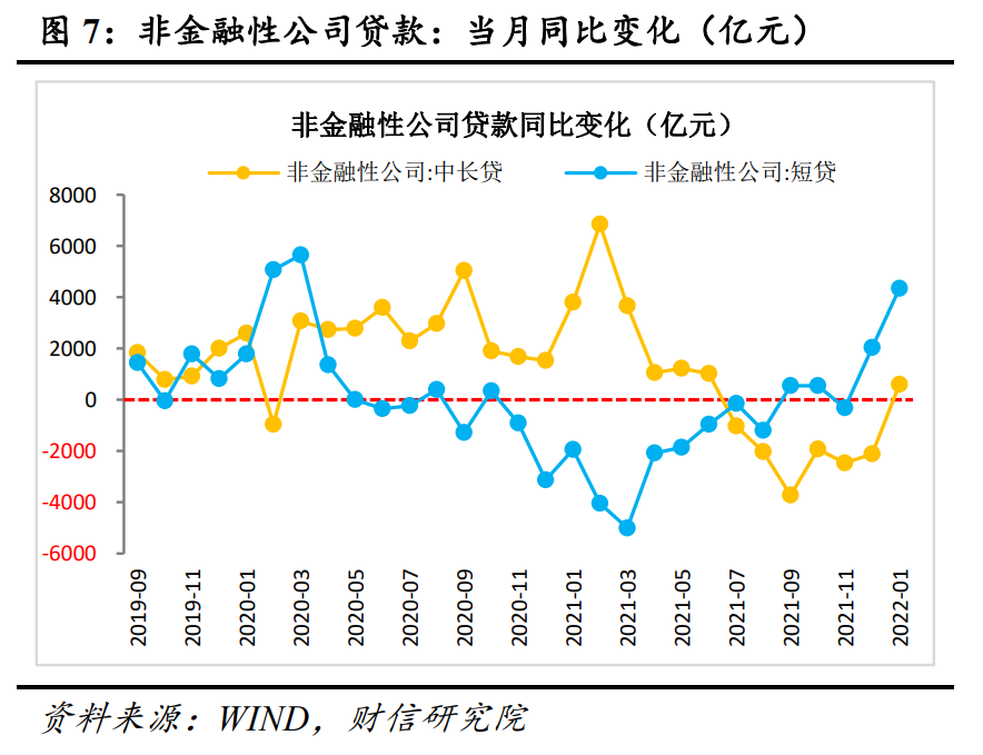 (一)企业端:短贷与票据同比大幅高增,中长贷亦创单月新高增至2.1万亿元。1月份,新增非金融性公司及其他部门贷款3.36万亿元,同比大幅多增8100亿元(见图6)。其中,受益于央行连续降准、降息,加大“窗口指导”推动信贷有力加快投放,本月企业新增短贷首次突破万亿元,同比多增4345亿元;票据融资继续冲量,同比多增3193亿元;此外企业新增中长期贷款亦创历史新高增至2.1万亿元,在去年高基数的基础上同比继续多增600亿元,结束连续六个月的同比减少(见图7)。企业信贷规模大幅改善:一是源于货币政策明显更加主动有为、更加积极进取且注重靠前发力,央行加大了对金融机构信贷投放的引导,以稳定市场预期、稳住宏观经济大盘;二是随着财政政策同样加快发力,基建等配套融资亦有所增加;三是房地产监管政策边际放松,也有利于前期过度收紧的房地产企业融资纠偏与改善。