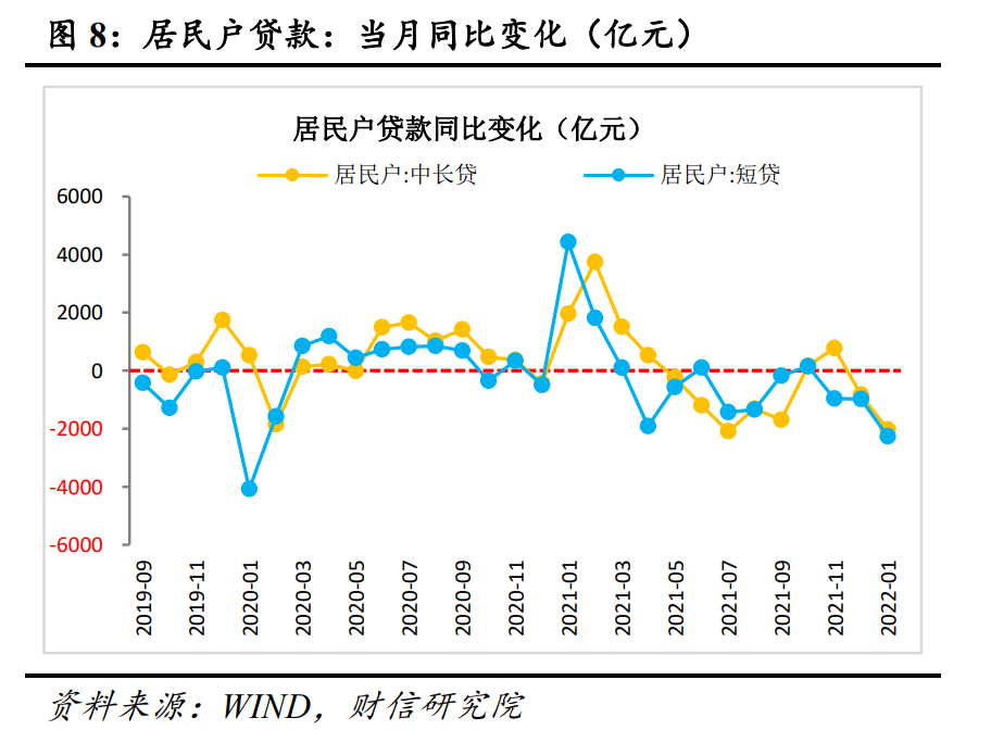 (二)居民端:消费疲弱拖累短贷收缩,地产预期尚未扭转导致中长贷同比减少。1月份居民部门新增贷款8430亿元,同比少增4270亿元(见图6)。其中,居民新增短贷约1000亿元,同比减少2272亿元(见图8),也低于近五年同期历史均值,表明受国内疫情加重影响,服务业、消费恢复偏弱导致居民消费类融资需求下降。同期居民新增中长贷7424亿元,同比减少2024亿元,连续两个月同比为负(见图8),表明房地产市场预期仍未明显扭转,居民购房意愿仍偏弱,如1月份国内30大中城市商品房成交面积同比下降约30%,降幅较上月还有所扩大,也反映出国内房地产市场需求总体偏冷,未来房地产投资仍面临较大下行压力。