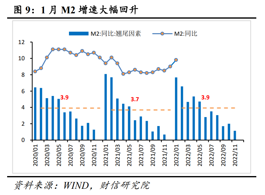 1月末M2同比增长9.8%,增速较上月大幅提高0.8个百分点(见图9),原因主要有三:一是信贷扩张导致贷款创造存款的信用货币创造加快,支撑M2增速大幅回升。二是去年同期基数下降也有利于M2增速提高,如2021年1月M2增速较上月回落0.7个百分点,有利于支持今年货币增速回升(见图9)。三是本月财政存款环比虽有所回升,但同比减少5851亿元,表明今年财政发力明显前置,财政支出总体增加,有利于阶段性增加同时段银行体系存款,亦会对M2形成一定支撑。