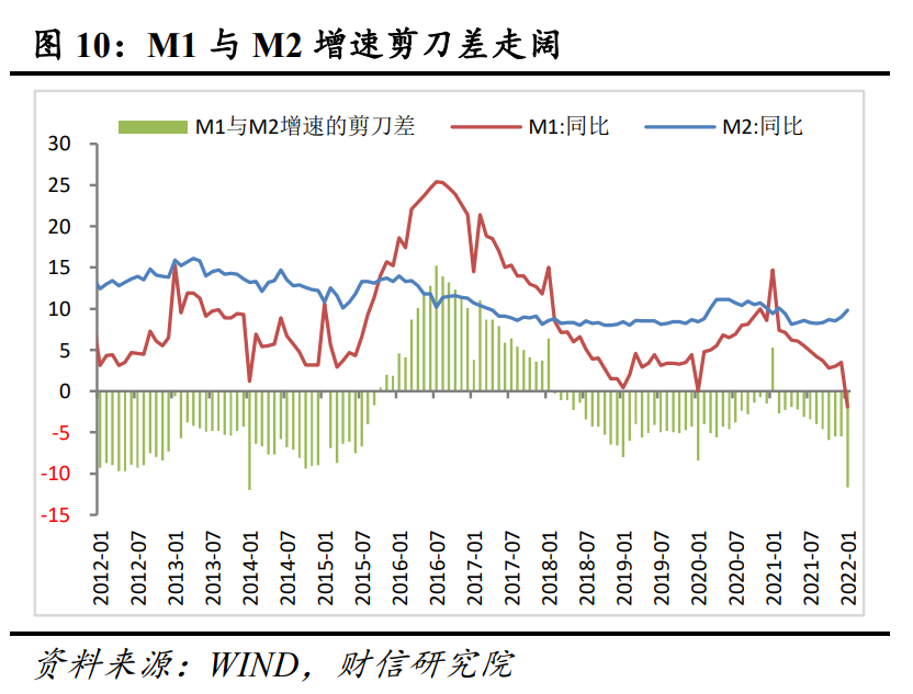 1月末M1同比下降1.9%,增速较上月降低5.4个百分点(见图10)。其中,单位活期存款占M1的比重超过80%,其增速由去年12月的2.8%降低至今年1月的-5.3%,是M1大幅回落的主因,同期M0增速则较上月提高10.8个百分点。单位活期存款增速下降:一是主要受春节错时的影响,如春节前由于企业集中发放薪酬、福利,单位活期存款会向个人存款转移,此时M1减少较多,2022年春节前最后一个工作日为1月30日,而2021年为2月10日、2020年为1月23日,导致2021年1月M1增速在低基数的影响下飙升到14.7%,拖累今年1月M1增速转负。二是企业盈利回落也不利于M1增速回升。根据央行测算,剔除春节错时因素影响,2022年1月M1同比增长约2%,亦处于偏低水平,表明随着企业盈利回落,企业现金流亦趋于边际恶化。