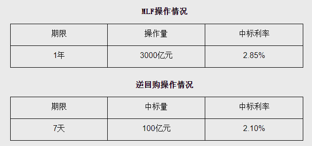 2022年2月15日,人民银行开展3000亿元中期借贷便利(MLF)操作(含对2月18日MLF到期的续做)和100亿元公开市场逆回购操作,中标利率分别为2.85%、2.10%,均同上期保持一致。