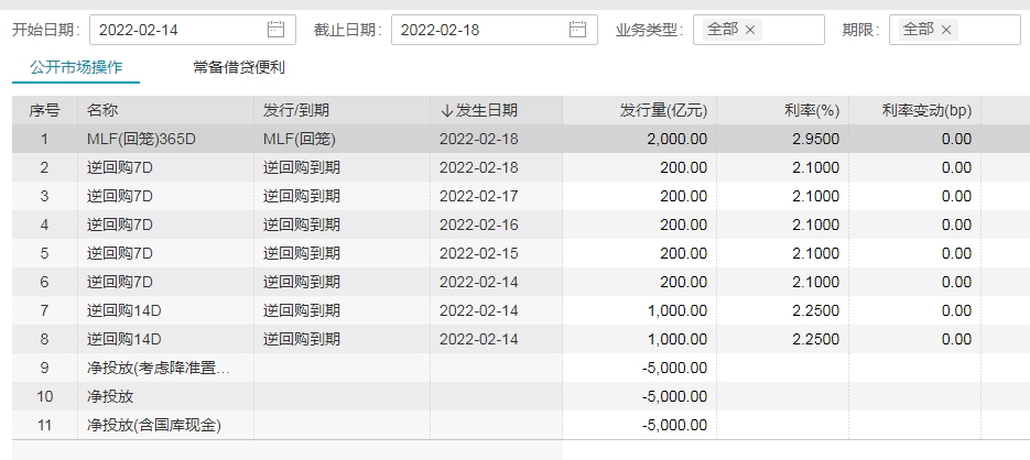 Wind数据显示,本周(2月14日至2月18日)央行公开市场将有3000亿元逆回购到期,其中周一至周五分别到期2200亿元、200亿元、200亿元、200亿元、200亿元。此外,周五还有2000亿元MLF到期。