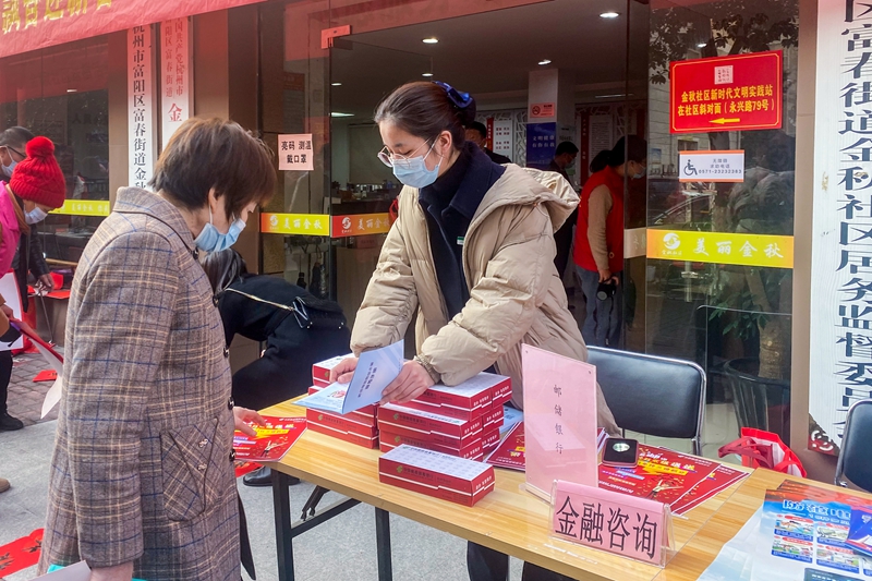日前,邮储银行浙江杭州富阳区金城路支行走进辖内金秋社区,开展了“幸富暖冬——先锋同行”活动,为社区群众送上反电信诈骗宣传及金融咨询服务。图为活动现场。  本报记者 刘志良 通讯员 骆晓燕 摄