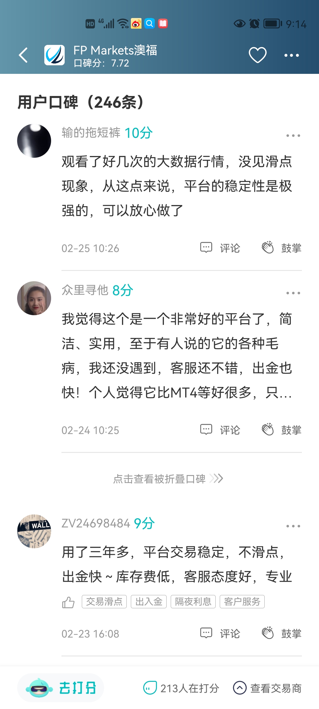 FP Markets有FCA的优质监管牌照,而且已经经营超过15年了,硬件非常完善。不仅如此,其也非常注意口碑,一位天网查用户评论称:“用了3年多,平台交易稳定,不滑点,出金快~库存费低,客服态度好”。